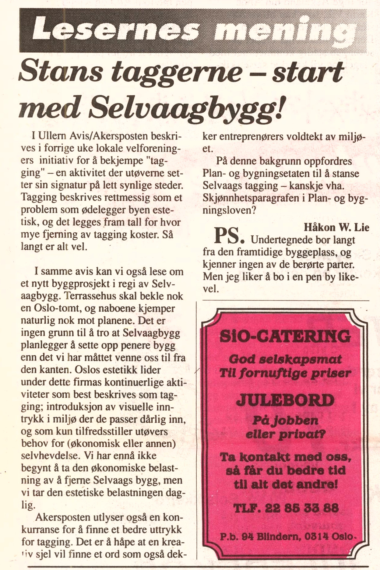 I samme avis kan vi også lese om et nytt byggprosjekt i regi av Selvaagbygg. Terrassehus skal bekle nok en Oslotomt, og naboene kjemper naturlig nok mot planene. Det er ingen grunn til å tro at Selvaagbygg planlegger å sette opp penere bygg enn det vi har måttet venne oss til fra den kanten. Oslos estetikk lider under dette firmas kontinuerlige aktiviteter som best beskrives som tagging; introduksjon av visuelle uttrykk i miljø der de passer dårlig inn, og som kun tilfredstiller utøvers behov for (økonomisk eller annen) selvhevdelse. Vi har ennå ikke begynt å ta den økonomiske belasting av å fjerne Selvågs bygg, men vi tar den estetiske belastningen daglig.