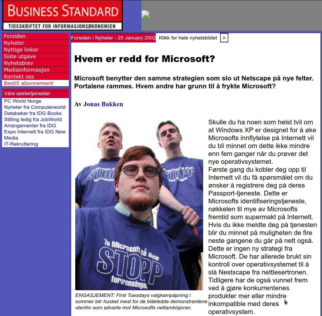Et hundretalls aksjonister med utgangspunkt i Elektronisk Forpost Norge og Norsk Unix User Group demonstrerete mot Microsoft ved Oslo konserthus 21. mai 2001. Anledningen var First Tuesday sitt arrangement med Norges politiske elite tilstede og Microsoft som hovedsponsor. Les mer om våre krav og argumenter i løpeseddelen.