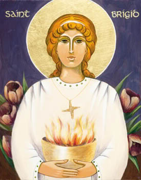 poultry raisers, printing presses, sailors, scholars, travellers, watermen | St. Brigit of Kildare | candle, lamp, bowl of fire, often with a cow nearby (usually a white,
